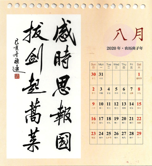 年末歲初,筆者收到了姚國培新出的2020年賀歲掛歷。這是一本設計新穎、制作精美、內容高雅、作品風格獨樹一幟的書法掛歷,用銅版紙印刷,每一幅作品都由姚國培自己創作、設計。