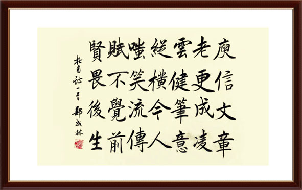 鄭成林學書,也屬家學淵源。他1959年生于福州三坊七巷依錦坊,幼年受故里文化熏陶,愛上書法。8歲入私塾拜師,漸露寫字之長,并在各個讀書階段均為宣傳骨干。1982年在著名書法家吳乃光帶領下,參與組建閩都畫院。在繁忙的公務之余,仍臨池不輟,深究筆法,猶愛二王體系,并融匯古今名家之長,筆法遒勁灑脫,結體端莊凝重,瀟灑飄逸,雅俗共賞,得到許多書家好評。