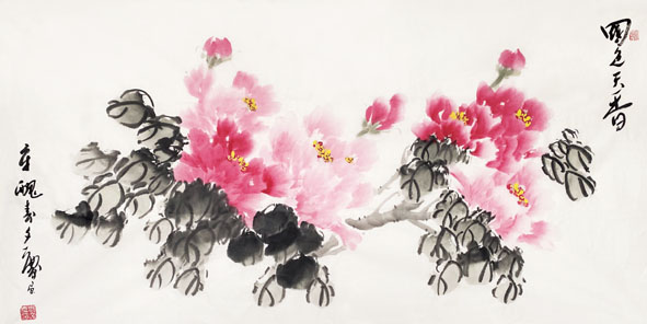 劉文慶擅長(zhǎng)寫意牡丹畫。“物在靈府,不在耳目,故得于心應(yīng)于手,孤姿絕狀,觸毫而出,氣沖交漠,與神為徒。”藝術(shù)創(chuàng)作不是以客觀再現(xiàn)為能事,一定要融入自己主觀感受。多年來,他把自己的所見、所聞、所感都融入繪畫過程中,畫出了許多千姿百態(tài)、姹紫嫣紅的牡丹,同時(shí),他也在畫牡丹過程中釋放自己情感,抒發(fā)自己的情懷,收獲人生的快樂。寫意手法畫出來的牡丹,水墨和宣紙的相互滲透和交融的意象效果好,能使人產(chǎn)生豐富的遐想。欣賞他的牡丹畫作品,我們可以看到,其審美特點(diǎn)講究的不是形似,不是生硬、呆板的描摹,也不是大紅大綠的表現(xiàn),而是通過構(gòu)思精巧、形似神俏、富有筆墨情趣的藝術(shù)形式追求牡丹本真和自然的表現(xiàn),追求牡丹“神韻”的表現(xiàn)。他筆下的牡丹花,呈現(xiàn)給人的是或陽光燦爛生機(jī)盎然,或飄逸幽靜,或嬌艷欲滴,總是形似神俏,靈動(dòng)含情,意蘊(yùn)飛揚(yáng),讓人能夠感受到濃濃的春意,聞到陣陣的花香,把牡丹的那種雍容華貴,花中之王的氣質(zhì)表現(xiàn)得淋漓盡致,讓人體味到一種積極向上,朝氣勃發(fā)的生命活力,具有很強(qiáng)的藝術(shù)感染力。