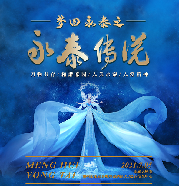 《夢回永泰之永泰傳說》由永泰縣政府聯合華盛文化傳媒有限公司共同打造。該劇目將永泰縣最具代表性的家文化、神話傳說、民風民俗等作為創作核心,圍繞“夢起海上絲路,打造東南明珠;傳承兩岸文明,演繹中國盛典”的定位,以當地家喻戶曉的張圣君傳說為創作主線,講述張圣君度化生靈、救濟眾生的故事,構筑了一個夢幻而絢麗的神話意境,是一部具有高度思想性和藝術性的舞臺精品力作。全劇以“萬物共存、和諧家園、大美永泰、大愛精神”為主要思想,將永泰的人文情懷、歷史傳說、大美山水等特色融入其中。由青云山開篇,引入母親河大樟溪,并融入“千年古樹”“百年莊寨”“養生溫泉”等永泰文化,彰顯了永泰歷史長河中的璀璨記憶。