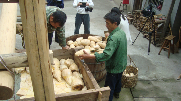 老雷把筍裝進竹筐里,用扁擔挑下山去。家中做筍主要還有他妻子雷菊英和女兒雷求花,只見她們把整個的筍一個個豎排著放進柴灶大鍋里,下圓上尖,造形美觀。他說這樣燒比較均勻,更容易去澀味。在大鍋里沸水煮約二三個小時,他用一根長竹筷由筍底部穿出一個個筍,放進筍桶里。他說筍漂洗個一二個小時就可以,主要是熟筍去堿去色。吃新鮮筍,這樣就可以了,用來切片炒吃,或用肉煮吃。如做筍干,就要加工,最麻煩的是做“明筍”筍干。就是清明前后的筍做的筍干,筍選擇要求不高,當然越嫩越好。工序是先將煮好漂好的鮮筍一個個裝進筍榨箱里,一層擺齊擺好后再鋪一層,接著用板鋪在上面。再鋪,鋪滿箱后,上面鋪上板,加上木條,將筍杠上栓繩在木輪上加緊,在榨梯上調整高低,讓箱上壓力增大,壓榨得里面出水。他說,“榨”很重要,以后每天榨輪上的繩子都要加緊。主要是把筍內的水榨出,里面不會生蟲和變色。做“明筍”筍干的筍要榨一個月左右,然后才起筍。將已壓得扁平的筍取出,用水洗和刷子刷干凈,鋪在篩子曬干,約曬幾個太陽?;蛘哂媚咎繝t火,上面加烤篩來烤干。一般100斤清明前的鮮筍可做6斤筍干,清明后鮮筍只能做5斤筍干,所以成本比較大。如做香菇筍干,就比較省事。最好是用清明前的頭批筍做,比較短小節少鮮嫩,將筍煮好漂好的筍用刀開邊破開,放進筍榨中榨一晚,取出洗一下,烤一晚,烤干就可。做其它階梯筍、茭筍、筍絲、筍片,就更簡單些,都是壓榨一下,曬干烤干,要吃時只要泡軟拿去炒就可。