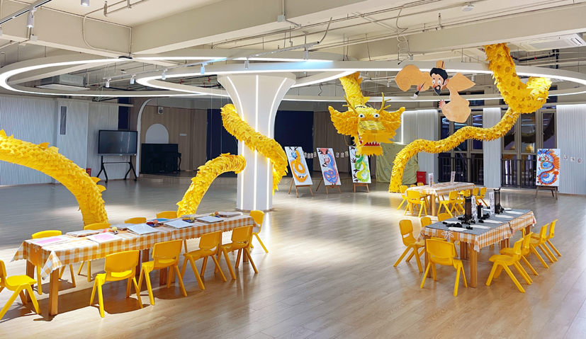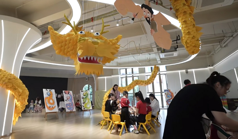 看,哪里來的鑼鼓聲,這么熱鬧,原來是小孩子喜氣洋洋,抬起了花轎。這個區域非常熱鬧,紅紅火火。抬花轎這個游戲出自《老鼠嫁女》繪本。由小朋友來演繹,有一番特別的滋味。有一個小朋友說,這是她第一次抬轎子,她的感受是要合作,轎子才會穩。四個人抬轎子,一定要齊心協力,才能夠穩當,小朋友在游戲中學到了知識。那么,這么有趣的小游戲是怎么設計出來的?據幼兒園老師胡夢佳介紹,平時和小朋友一起學習的時候,發現小孩子對《老鼠嫁女》這個繪本非常感興趣,里面有喜字,還有花轎,都是小孩子非常感興趣的,于是我們剛好通過六一繪本游樂活動,就結合起來了,讓孩子們感受傳統的嫁娶儀式,經典與童趣結合在一起,感覺非常棒!在“畫龍點睛”尋龍記游園館內,一條金燦燦的祥龍吸引住了小朋友,里面所有的內容都與龍有關。小朋友手中拿的也都是與龍有關的各種手工作品,有水墨畫龍的扇子,有拓印著龍的圖案的手工布袋,還有這個五顏六色的手工祥龍等等。