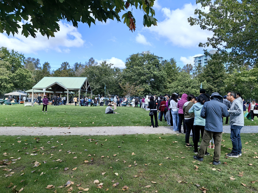 中秋節前夕,我受邀參加加拿大福建同鄉聯誼會組織的博餅、燒烤活動,為了添加活動氣氛,我寫了一幅“同舟共濟”的書法作品送給林偉揚會長。我們上午10點到活動地點時已人山人海,三四百名福建同鄉聚集在溫哥華Riverfront Park(海濱公園),空曠的草地上整整齊齊地擺放著12張小方桌,每桌12人,從上午10點開始一直到下午3點分三批(次)進行博餅,那天我的手氣不錯,雖然沒有大獎,但小獎不斷,獎品不少。主辦方為了讓大家吃好喝好,還特地從閩人開的一家夜宴燒烤店請來四五位廚師為大家燒烤,三四臺烤爐、烤箱全上陣,有烤羊肉串的、三明治的,還有烤牛肉的、面包的等。午飯時分,大家排起了長隊。在等待和燒烤中體驗那份簡單而純粹的生活樂趣,這種自由、開放的生活方式使燒烤更有趣味。