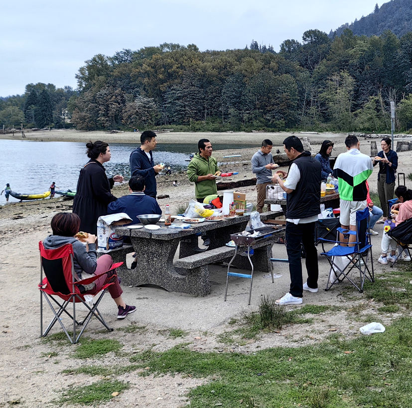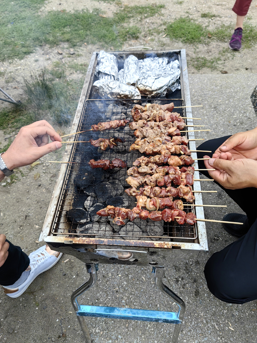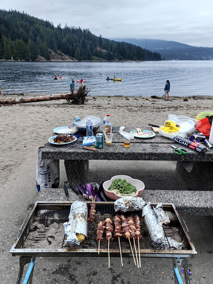 隨著時間的推移,燒烤逐漸演化成為一種社交活動,成為了人們回歸自然、分享食物、交流情感的重要方式。前不久,我到加拿大溫哥華探親,浦城小老鄉朱一飛先生專門安排了一次別開生面的活動——在一個太平洋海灣燒烤。根據汽車導航我們來到溫哥華本拿比北部的指定地點,大家分別從車上卸下烤箱、烤爐、帳篷、游艇和一堆食物,各就各位架好燒烤工具。一飛先生夫婦忙前忙后地圍爐煮茶,十多人隨席入坐,品著熱氣騰騰的奶茶,就著海浪撞擊礁石的濤聲和撲鼻的茶香閑聊。茶敘后,一飛獨自在一旁忙著他的橡皮艇準備下海,他告訴我:“這片海域很多螃蟹,這艘橡皮艇剛從中國買來,今天是首航。”小朋友們時而在沙灘,時而在草坪亦或帳篷里嬉戲。十多人中,除了來自中國之外,還有日本、美國和加拿大的幾位朋友,大家來自四面八方,面朝大海,談笑風生。不一會兒功夫,一飛滿載而歸。三臺烤爐、烤箱分工合作,開足馬力一齊上陣:一臺燒烤地瓜、三明治、意大利面等主食;一臺燒烤魚、蝦、螃蟹、青口等海鮮;一臺燒烤牛肉串、羊肉串、雞翅等。燒烤架上,海鮮與牛羊肉滋滋作響,油脂滴落在炭火上,激起一陣陣誘人的香味和煙霧,那是大自然與人類智慧交融的味道。在這片無垠的太平洋海灣,大家忘卻了都市的喧囂,回歸自然,讓人在自然的懷抱中放松身心,感受大自然的寧靜與美好和食物與火焰共舞的魅力。