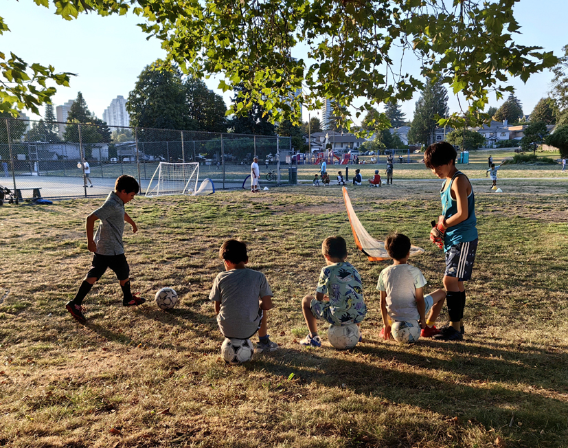 我沿著公園邊緣的步道散步,走了一圈下來,發現公園既沒有大門,也沒有圍欄和明顯的標志性建筑物,只是僅僅在道路旁邊的草坪上立著一塊不起眼的牌子,上面寫著Ernie Winch Park,即溫奇公園。我想,還有什么標志比得上這三四十畝的綠色生態公園更引人注目呢?不遠處,只見兩撥孩子分別圍著兩名教練抑或家長在踢足球,眼前這二三十多名孩子的年齡大至為七八歲,烈日下個個汗流浹背、生龍活虎地穿梭馳騁在球場上。緊挨著的兩個網球場又是另一番景象,一名八九歲的女孩與她的父親在打網球,女孩揮舞著球拍,動作嫻熟,扣球有力,儼然一位小專業運動員。一旁還有一對年輕夫妻陪著一個大約只有二歲左右的男孩玩足球,更有甚者的是,只見一個一歲多的男孩穿著尿布濕在音樂噴水廣場上被淋的濕漉漉的來回穿梭。此外,還有打排球、打乒乓球的,一些年齡更小的幼兒在家長的照看下玩滑滑梯、蕩秋千等。也有溜狗的、閑聊的、躺在草坪上聽音樂的。我的外孫和外孫女則與他的另一個同學騎著自行車在草坪上你追我趕,玩得不亦樂乎。在休息區,一群大人和小孩圍著一個臨時攤點購物,我移步駐足觀看,原來是幾位母親分別帶著她們的孩子在賣Chips、Pocky等零食,一位母親告訴我:“從小培養孩子自食其力的能力及商業意識很重要,孩子有了健康的身體和商業頭腦,長大后就會有較好的發展前景。”讓我大跌眼鏡的是,這4名孩子中,年齡最小的居然只有6歲,最大的也才8歲,而這種商業體驗兩年前就開始了。